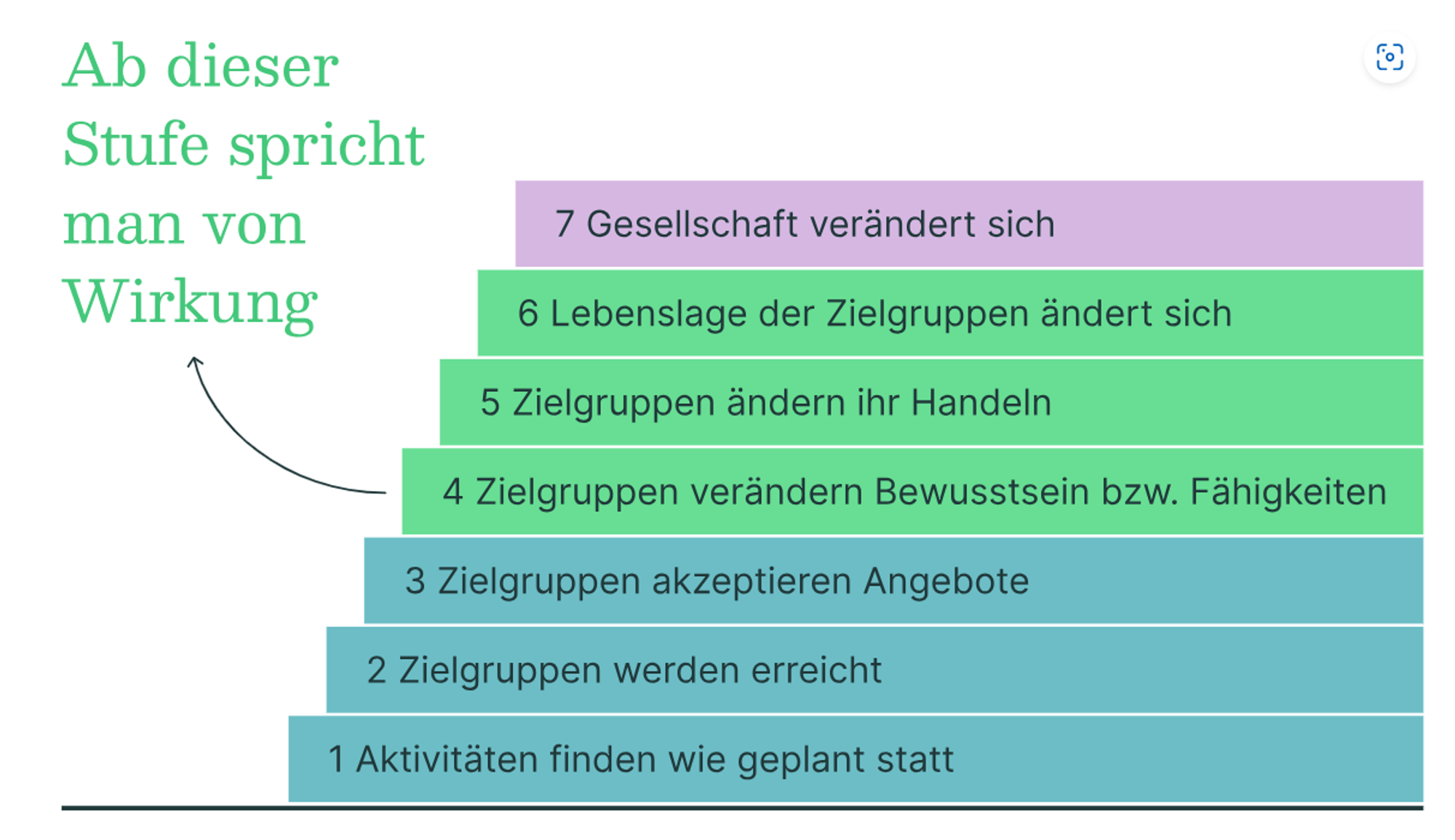 Von Wirkung oder social impact spricht man, wenn eine Aktivität zu Veränderungen bei der Zielgruppe, im Umfeld der Zielgruppe oder in der Gesellschaft. Mithilfe der Wirkungsorientierung fragt ihr euch also: Was will ich eigentlich genau erreichen und wie kann ich das genau tun?